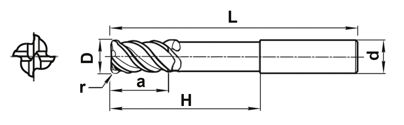 Концевая 4-х зубая фреза с центральным зубом и радиусом при вершине с удлиненной рабочей частью с шейкой