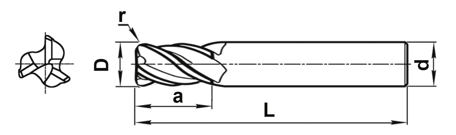 Концевая 3-х зубая фреза с центральным зубом с радиусом при вершине MT190VB-018Z18R03-32-L092-r20-AL DLC