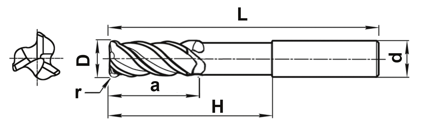 Концевая 3-х зубая фреза с центральным зубом с удлиненной рабочей частью с шейкой с радиусом при вершине MT190VBE-010Z10R03-22-H060-L100-r05-AL DLC