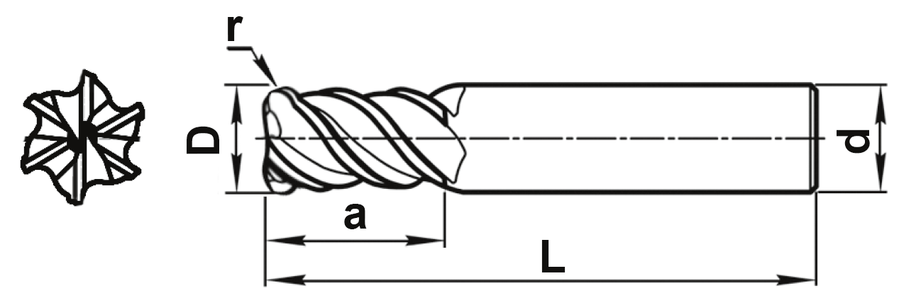 Концевая 6-ти зубая фреза с центральным зубом с радиусом при вершине