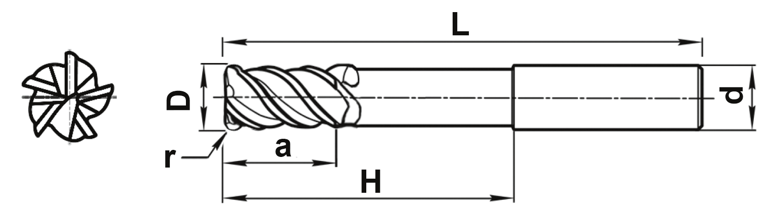 Концевая 5-ти зубая фреза с центральным зубом с удлиненной рабочей частью с шейкой с радиусом при вершине