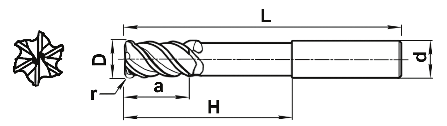 Концевая 6-ти зубая фреза с центральным зубом с удлиненной рабочей частью с шейкой с радиусом при вершине