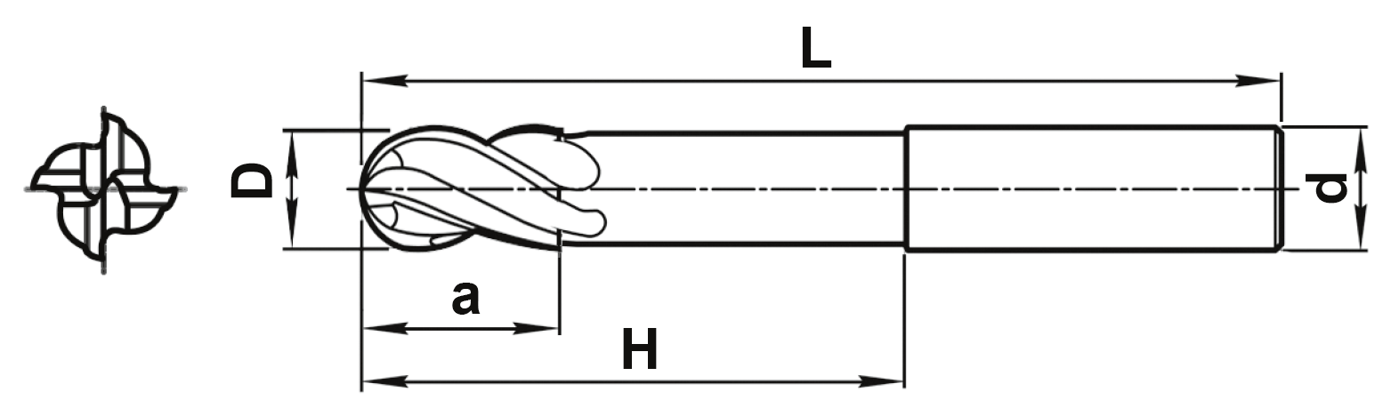 Концевая 4-х зубая полушаровая фреза с удлиненной рабочей частью с шейкой