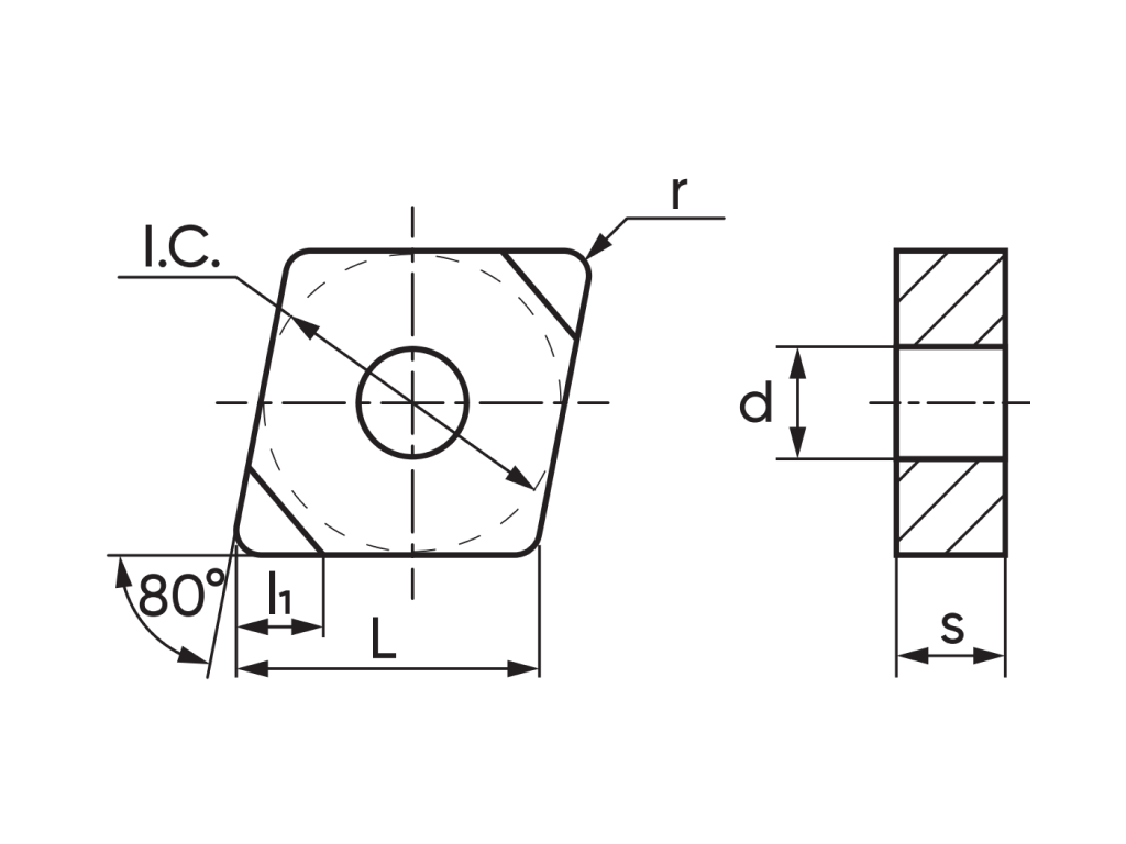Токарная пластина с напайными вставками из кубического нитрида бора. Форма пластины ромбическая C - угол 80°. Задний угол N – 0°. Класс точности пластины – G. ...