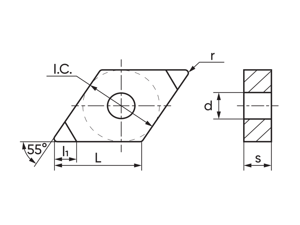 Токарная пластина с напайными вставками из кубического нитрида бора. Форма пластины ромбическая D - угол 55°. Задний угол N – 0°. Класс точности пластины – G. ...