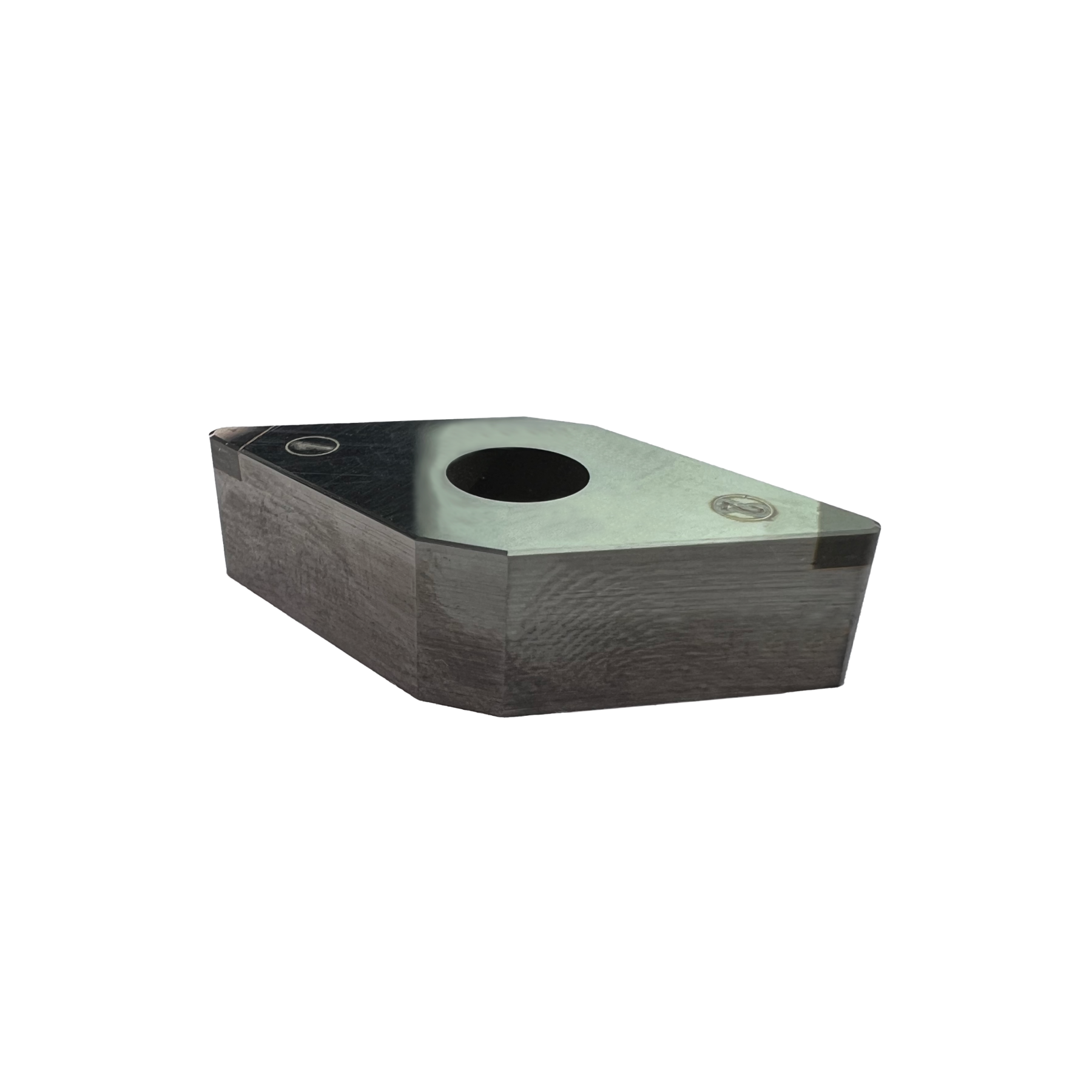 Токарная пластина с напайными вставками из кубического нитрида бора. Форма пластины ромбическая D - угол 55°. Задний угол N – 0°. Класс точности пластины – M. ...