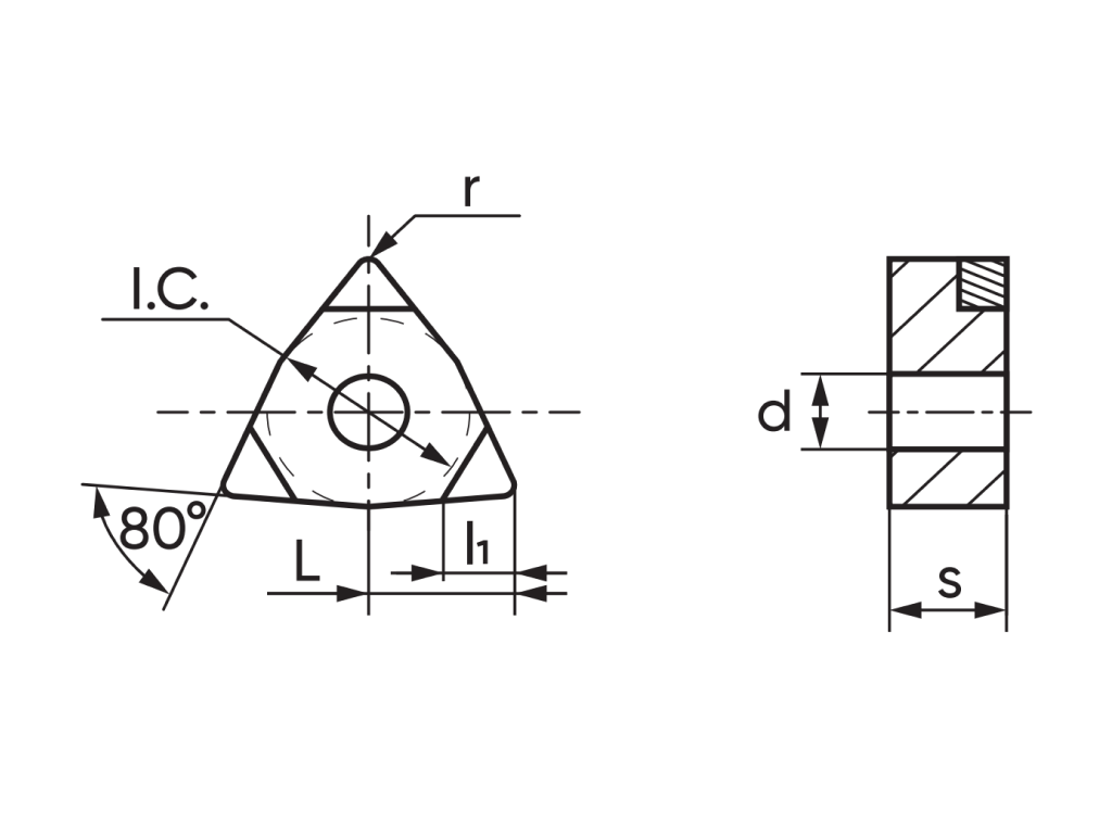 Токарная пластина с напайными вставками из кубического нитрида бора. Форма пластины ломаный треугольник W - угол 80°. Задний угол N – 0°. Класс точности ...
