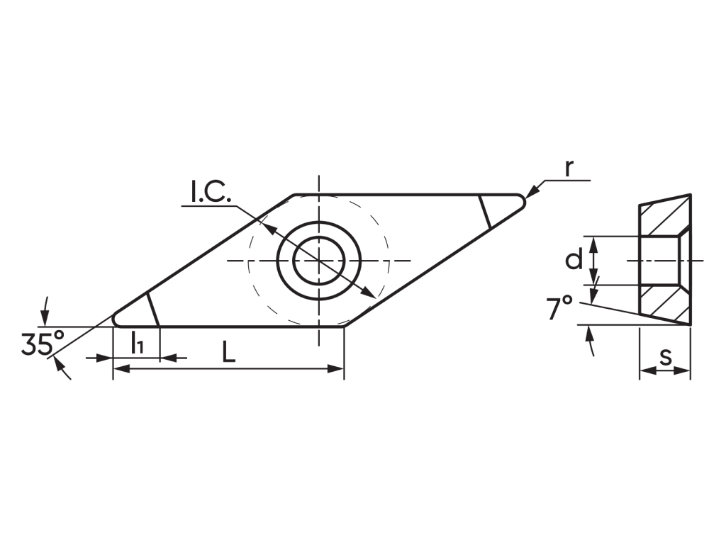 Токарная пластина с напайными вставками из поликристаллического алмаза. Форма пластины ромбическая V - угол 35°. Задний угол C - 7°. Класс точности пластины – ...