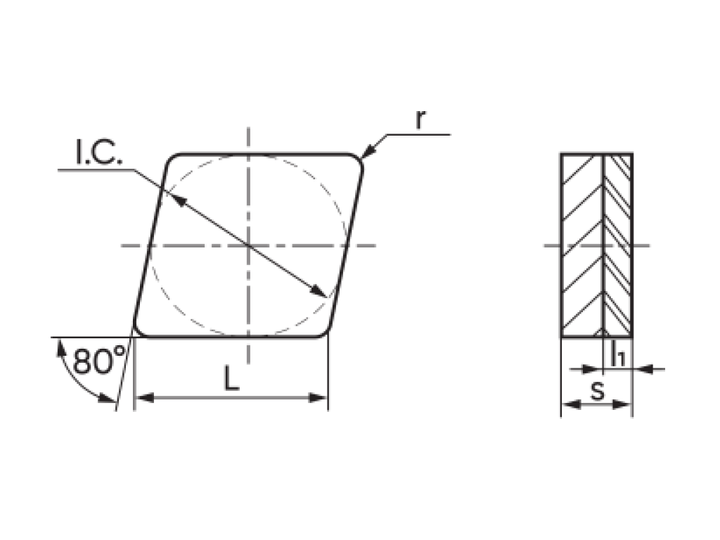 Токарная пластина с напайной вставкой из поликристаллического алмаза. Форма пластины ромбическая C - угол 80°. Задний угол N – 0°. Класс точности пластины – M. ...