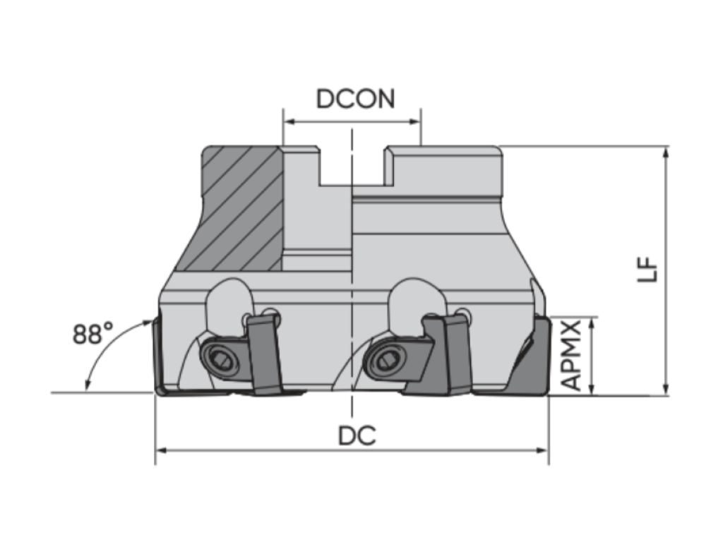 Корпус фрезы с посадочными местами под сменные режущие пластины типа SN.N 1204.. . Тип инструмента F - торцевая фреза. Главный угол в плане - 88°. Диаметр фрезы - 50 мм. Число зубьев (общее количество пластин) - 5 шт. Посадочный диаметр - 22 мм. Длина рабочей части - 40 мм. Способ крепления пластин - винтом. |